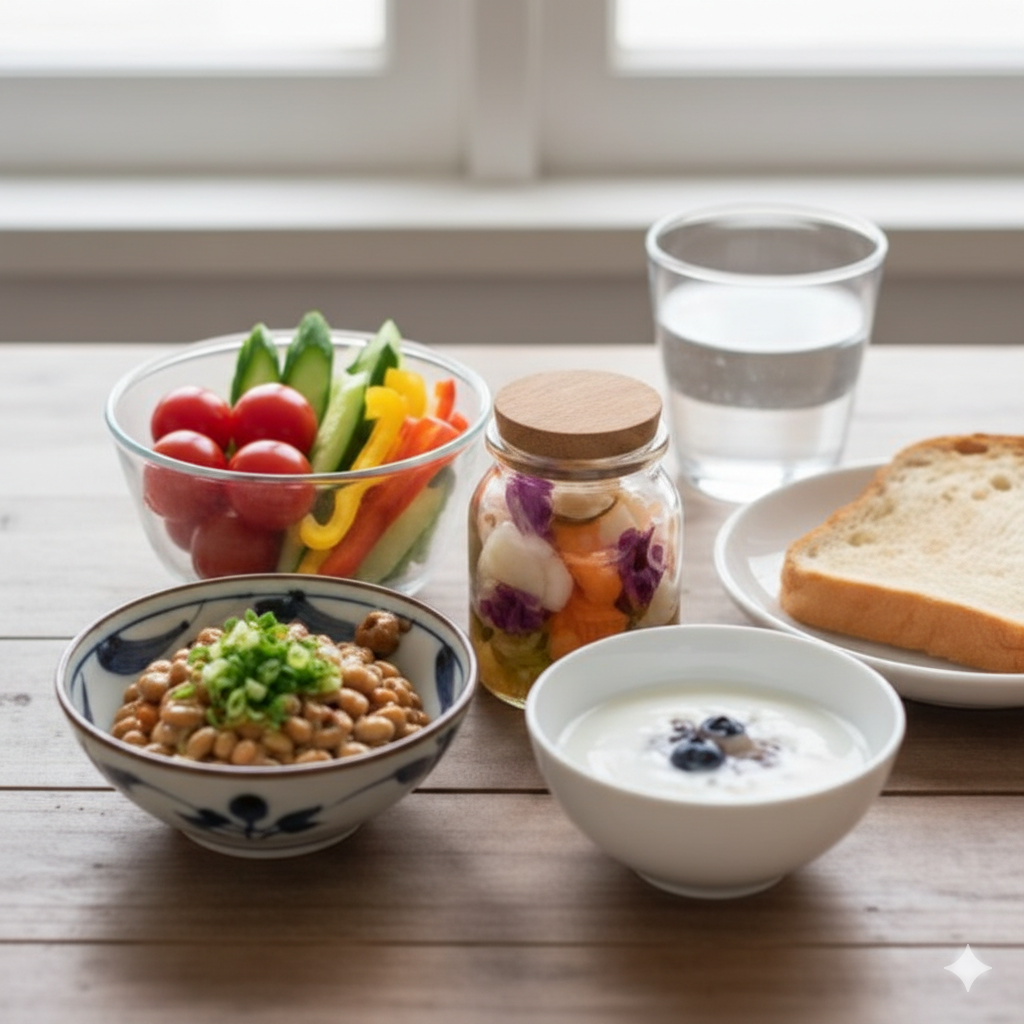 納豆、ヨーグルト、自家製のピクルスなどの発酵食品を別容器に入れる。